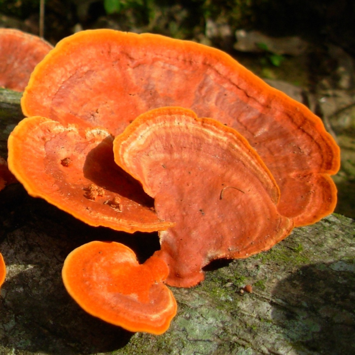 Fungo poliporoide, orelha-de-pau, degradador de madeira morta, comum em locais ensolarados. Seu nome tem origem na sua coloração avermelhada viva, que também pode variar para um laranja avermelhado.